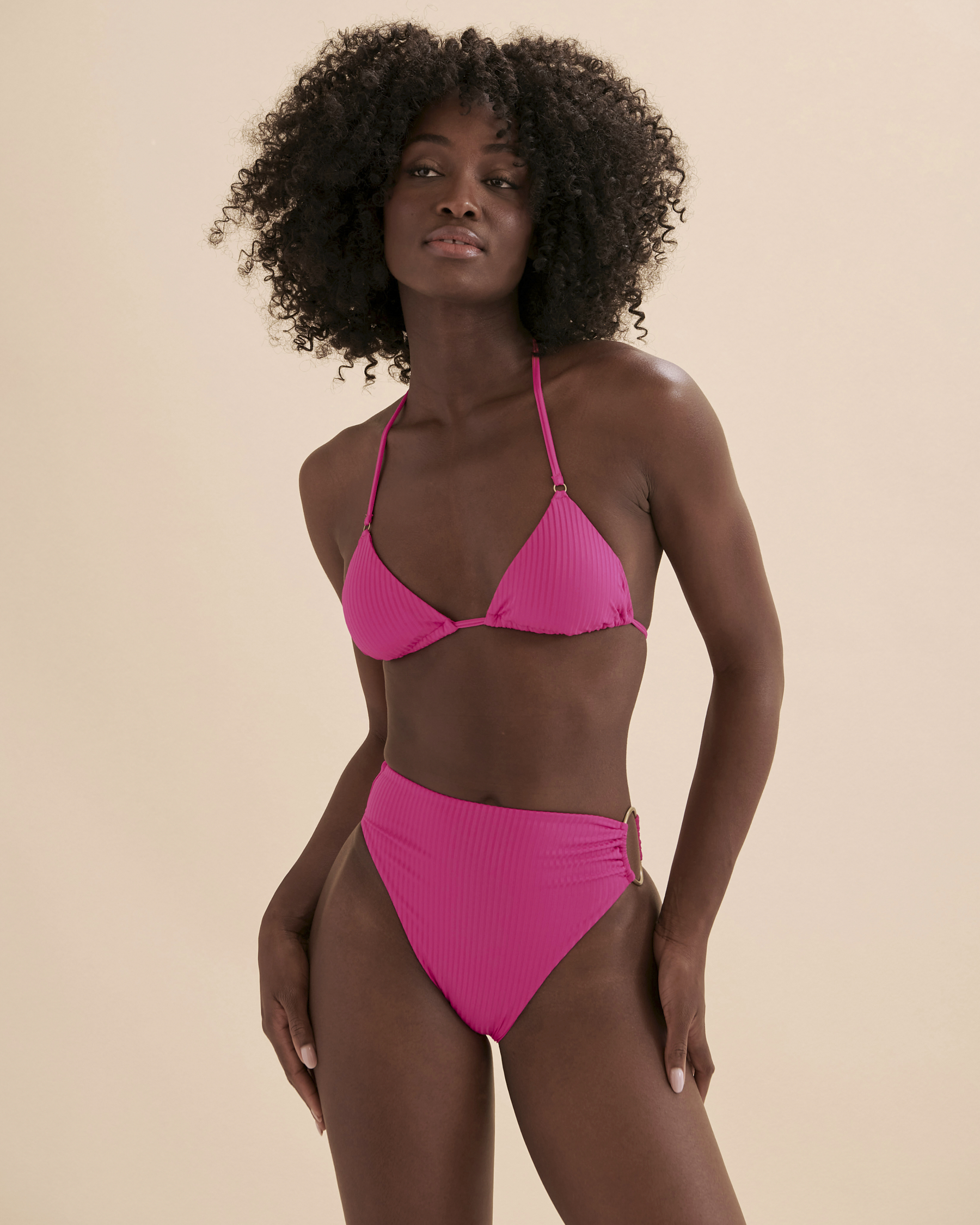 This radiant pink bikini top exudes a bold and vibrant energy while offering a flattering style for a standout beach look.