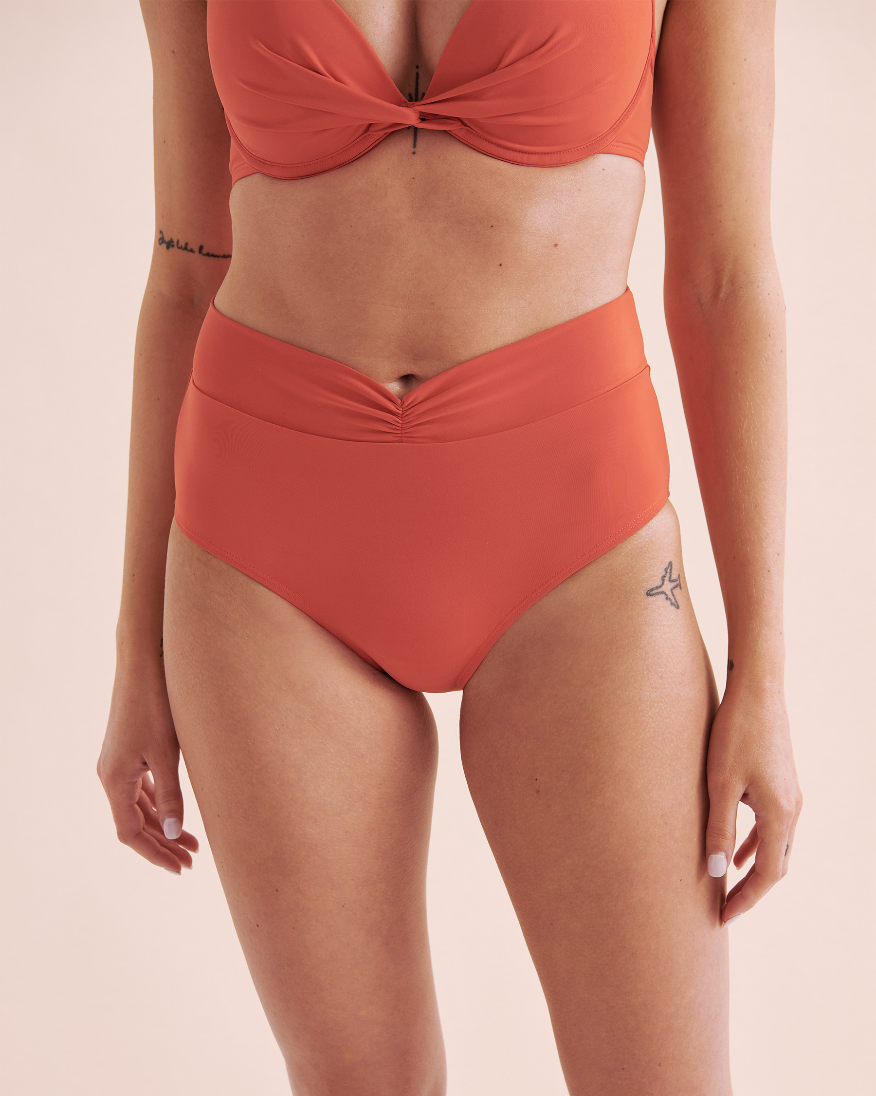 Découvrez le bas de bikini coupe en V Sunset in Portofino, un modèle chic et intemporel qui allie confort et élégance. Sa taille haute et sa coupe en V devant créent une silhouette flatteuse, tandis que la doublure powermesh offre un maintien optimal. Avec une couverture complète à l'arrière, ce bas de bikini vous garantit un soutien tout en mettant en valeur votre forme. Le froncé à la taille avec l'inclusion d’un anneau ajoute une touche de détail unique et raffinée. Sa couleur paprika apporte une note chaude et estivale à votre look.