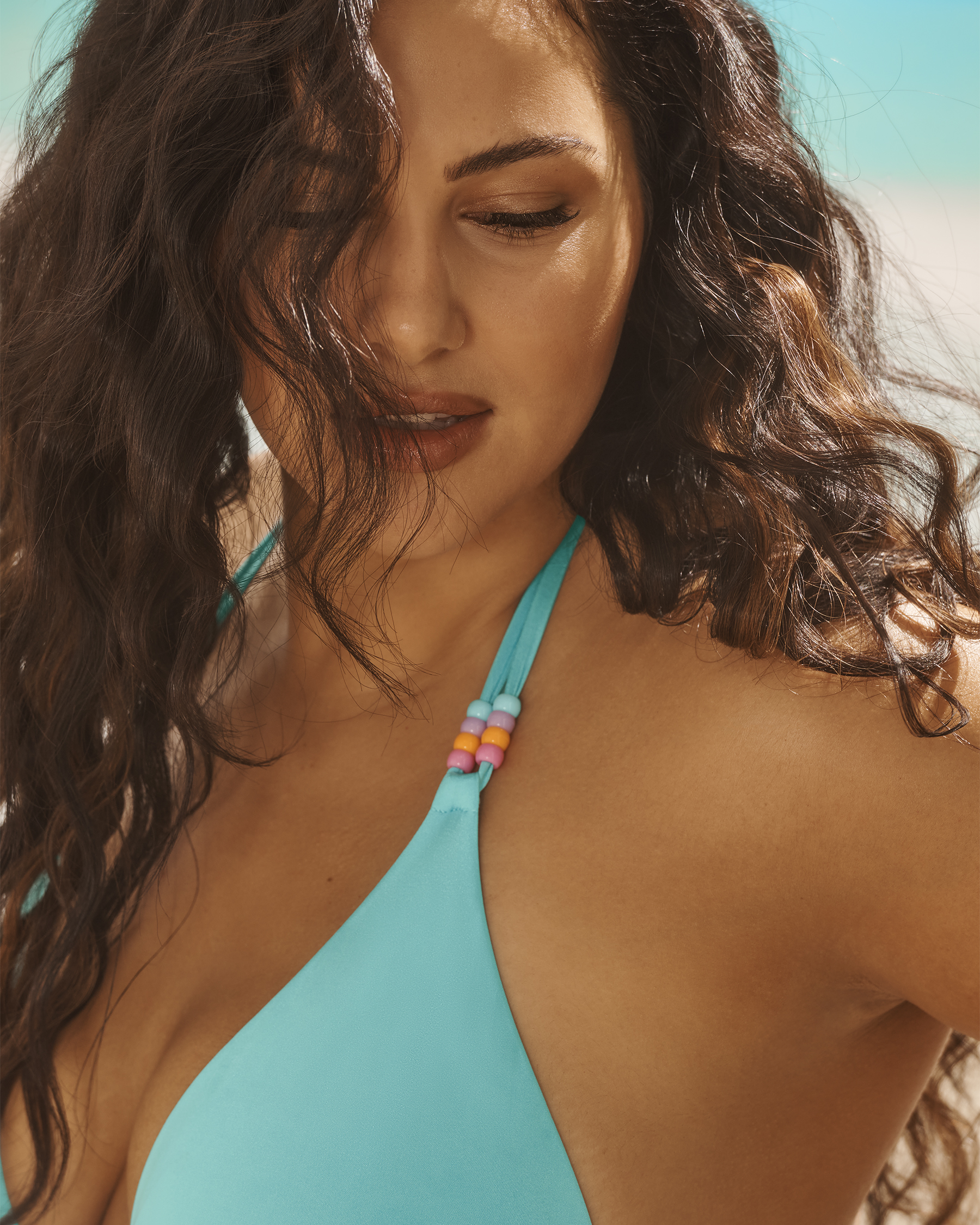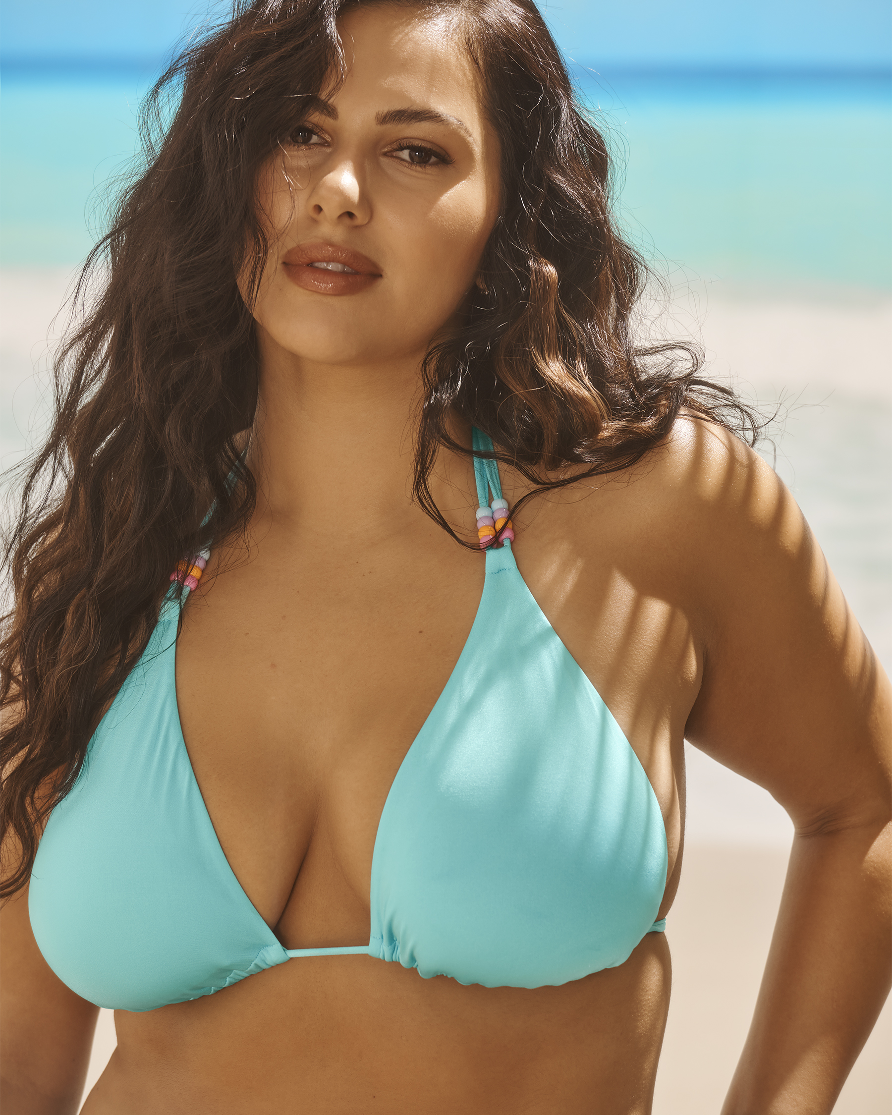 Un haut de bikini triangle avec un design confortable qui permet de mettre naturellement en valeur le décolleté. Le tissu scintillant et les perles aux bretelles sont des détails parfaits pour cette pièce déjà si tendance.
