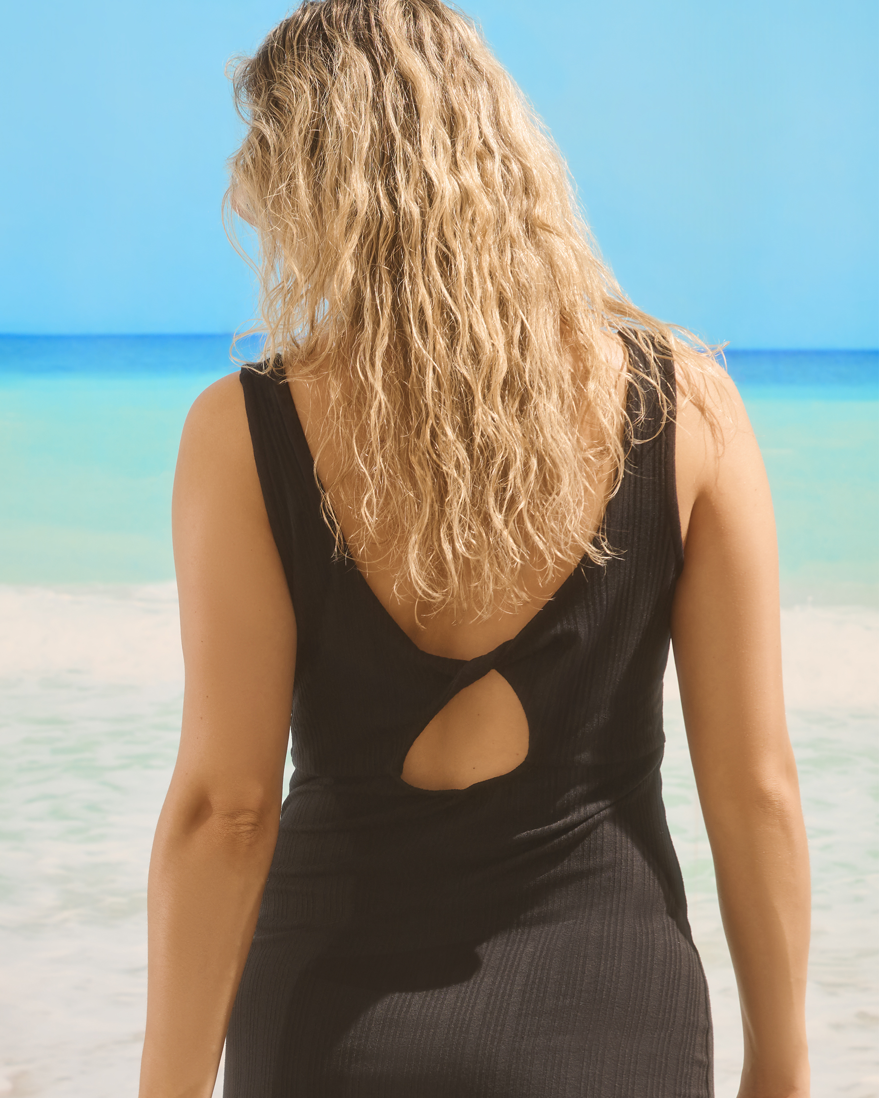 This black ribbed dress from MyBikiniStory embodies relaxed modern elegance designed to flatter all body types. Made from a ribbed fabric that combines comfort and flexibility it features a slip-on sleeveless design that highlights freedom of movement. The U-neckline creates a feminine refined look while the detailed twisted back adds a subtle touch of sensuality and sophistication. Perfect for sunny days or summer evenings this piece effortlessly adapts to any occasion.